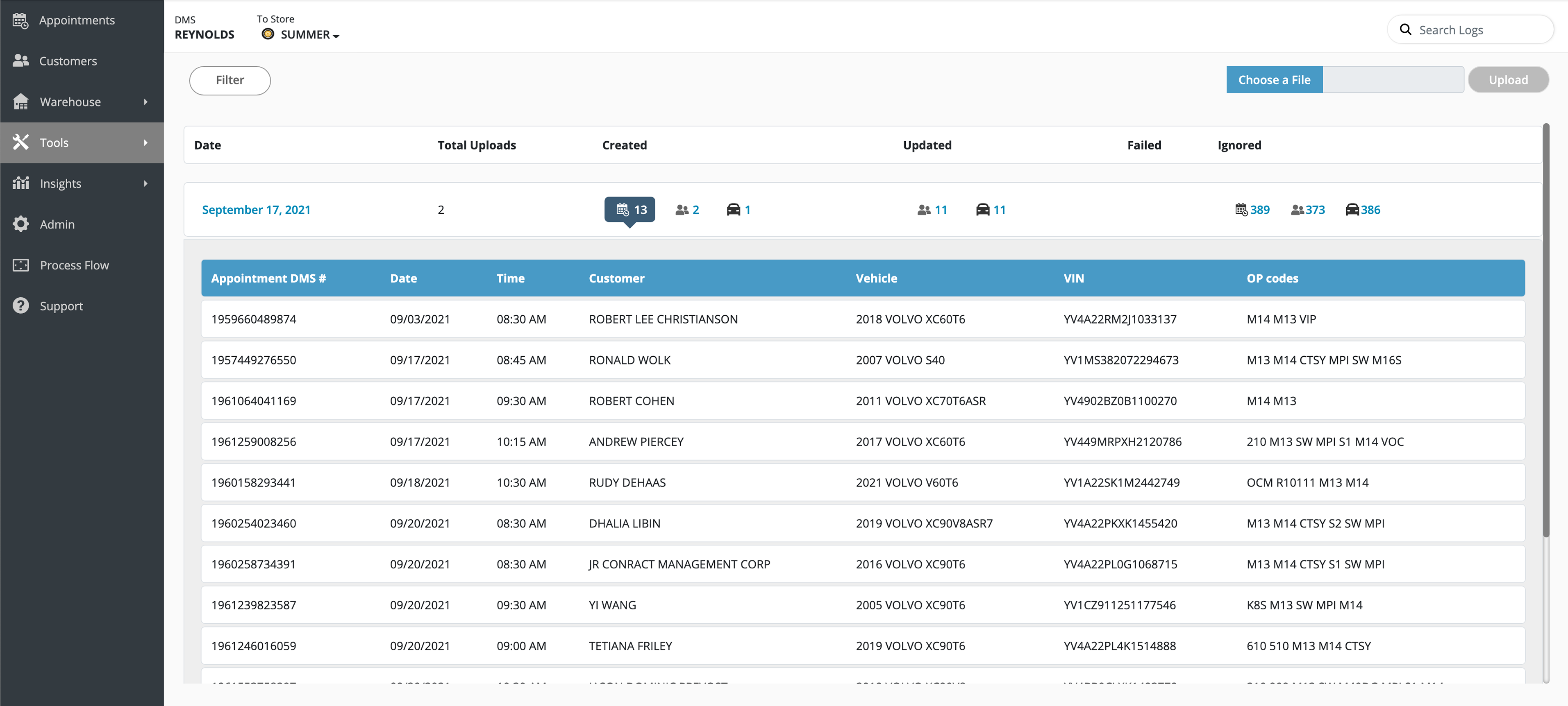 Dealers configured with manual DMS upload for ADP (CDK) or Reynolds can export the TSS Appointments report from their reporting system and upload the report to TSS to transfer tire storage appointments.
