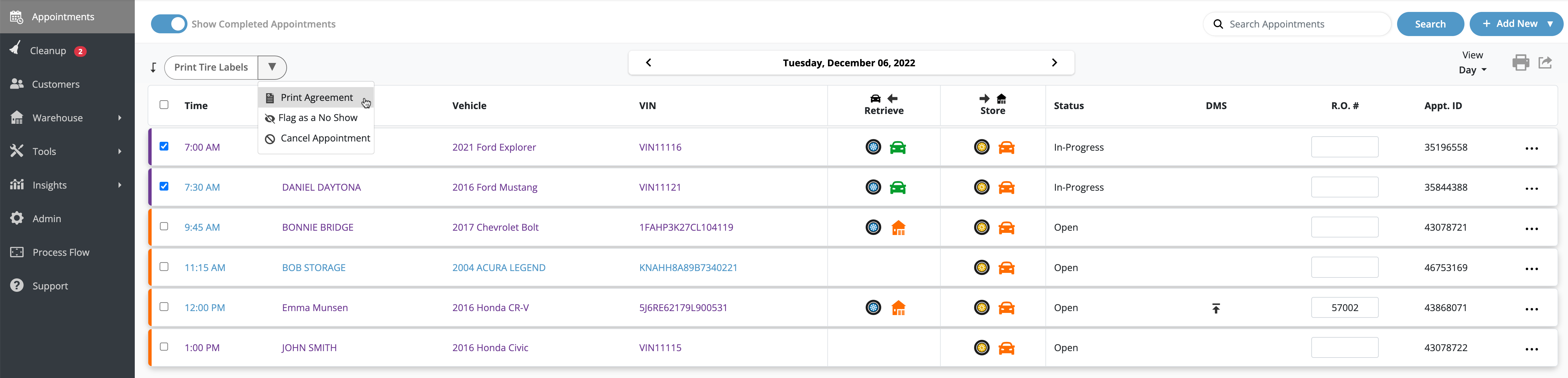 - Select the appointments for which a Tire Storage Agreement is required.
