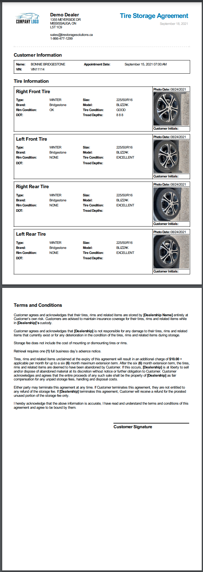 The Tire Storage Agreement is a tool dealerships can use to ensure that their seasonal tire storage customers are aware of the condition their tires were left in and the terms and condition's of the dealership's seasonal tire storage program.