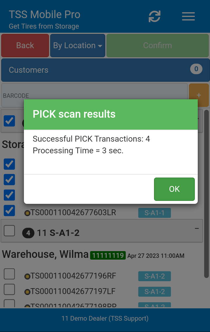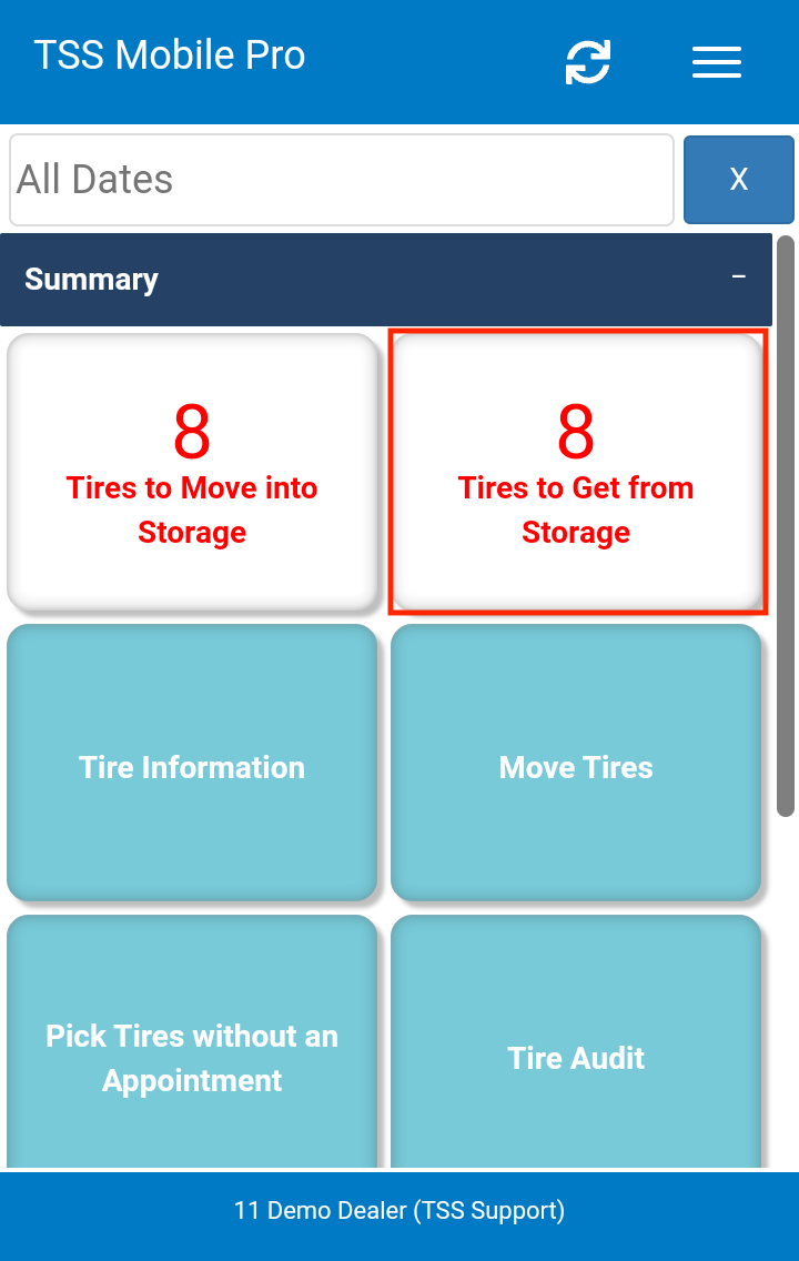 Tires that have appointments with PICK orders will be listed on the app in the Tires to Get from Storage tile.
