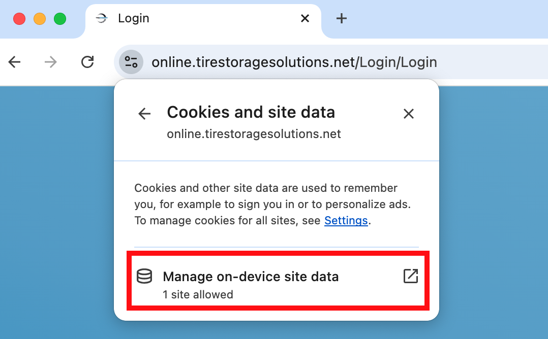 1. Navigate to online.tirestoragesolutions.net and click on the Settings icon to the left of the website address. Click on the Cookies and site data option.