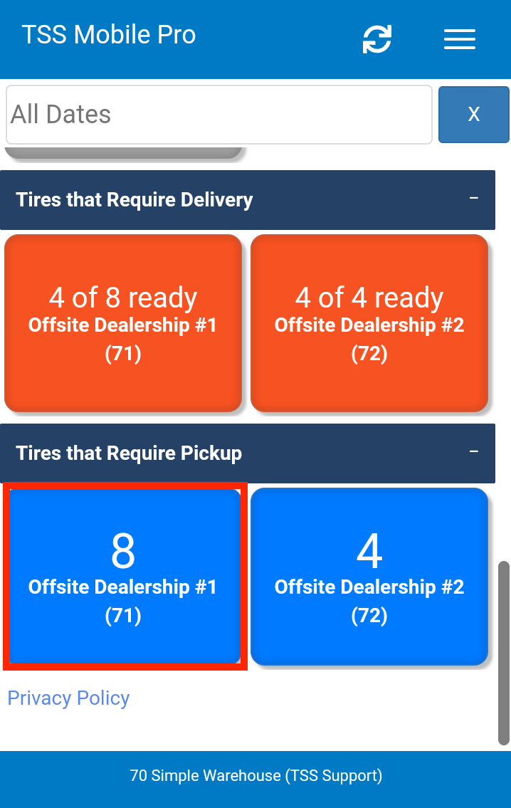 Tires that have appointments with PUT orders will be listed on the app in the Tires to Move into Storage tile as well as the Dealership Pickup tiles.