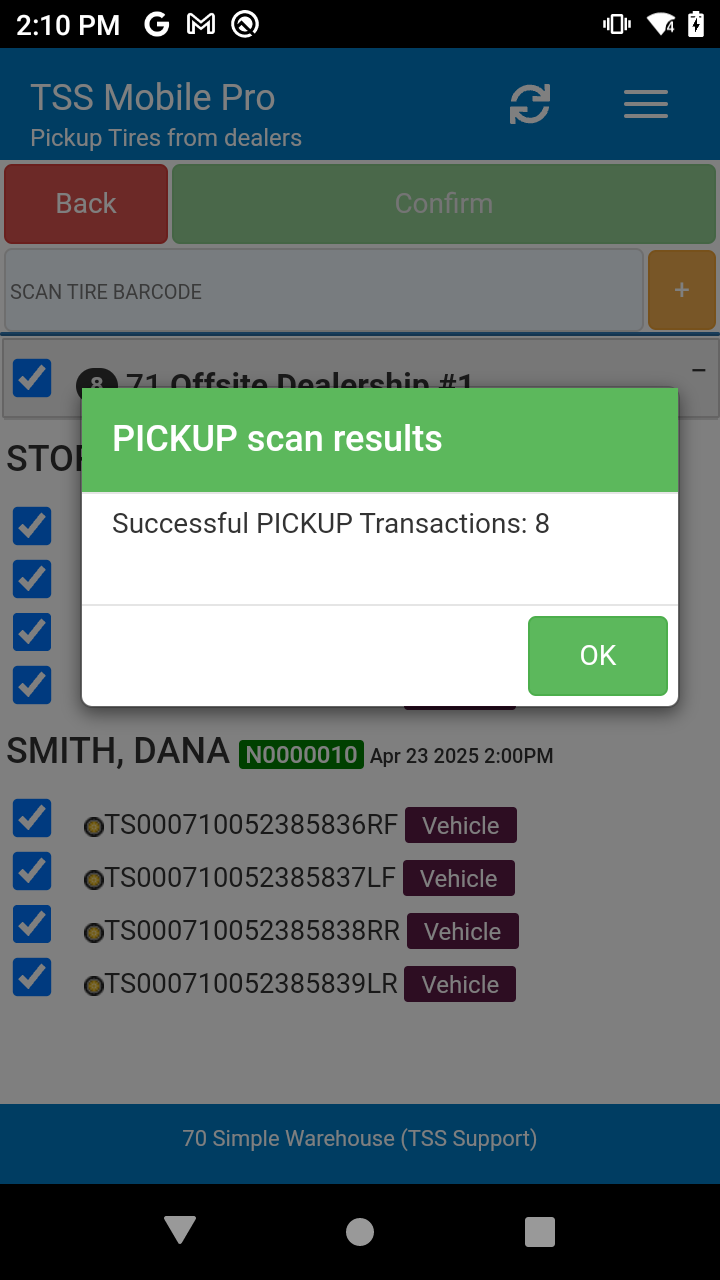 2. Scan or select the tires that are being picked up and tap the Confirm button. Note: Warehouses that have Dealer Staging enabled may be required to scan the dealer staging label before scanning tires for pickup. | ![]() |