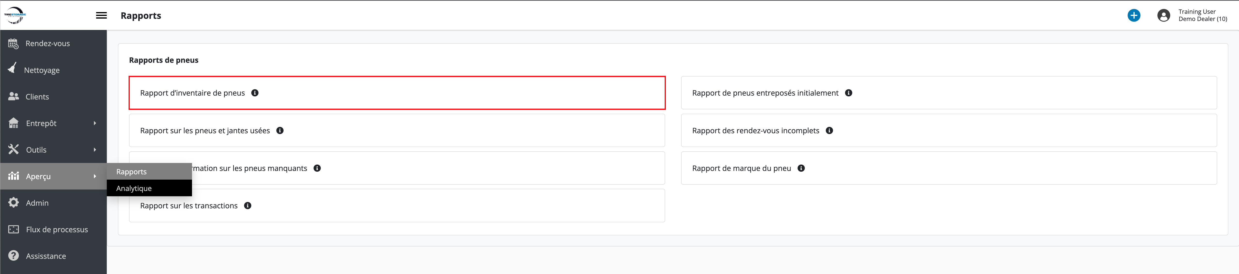 - Accédez à Aperçu → Rapports → Rapport d’inventaire de pneus.