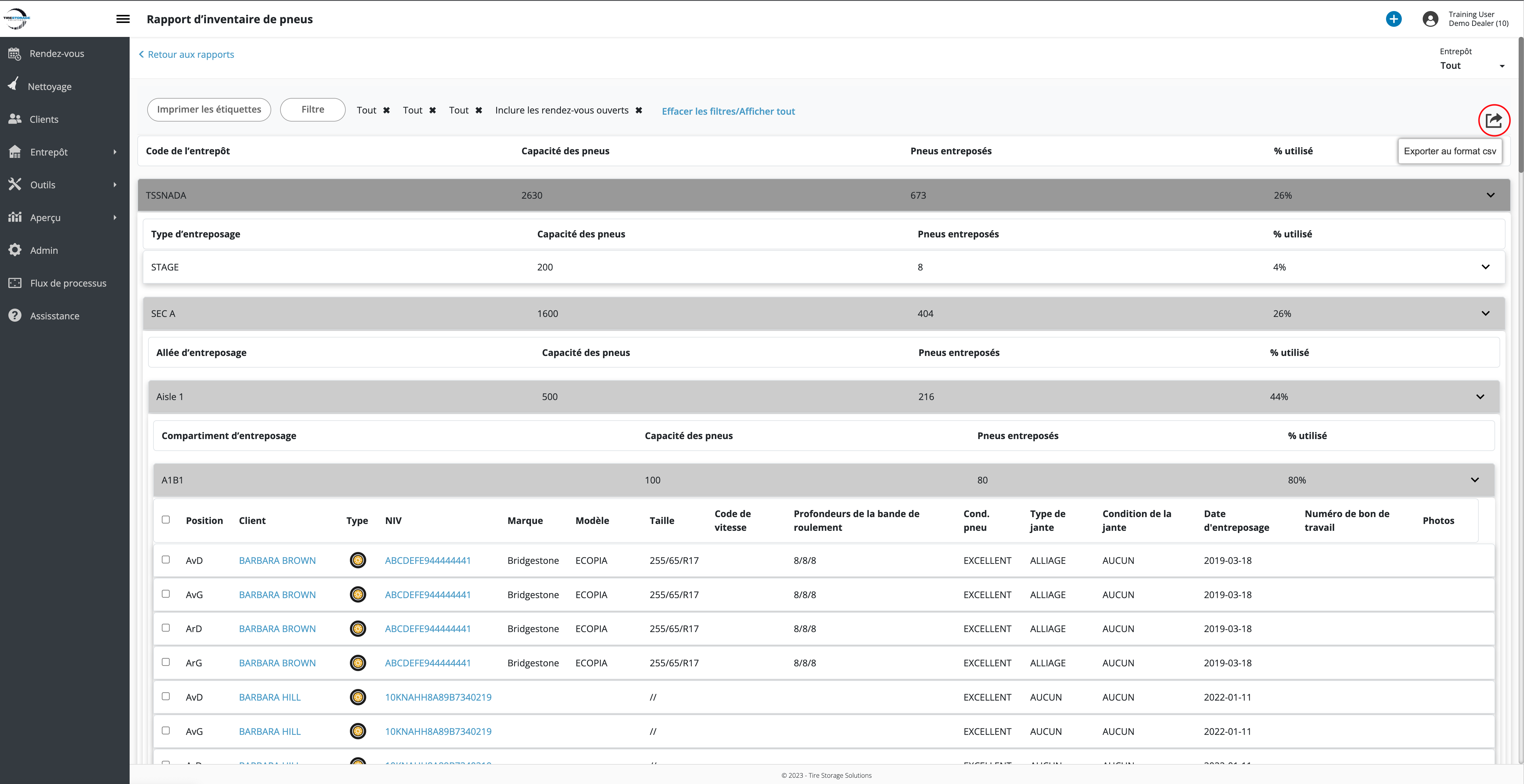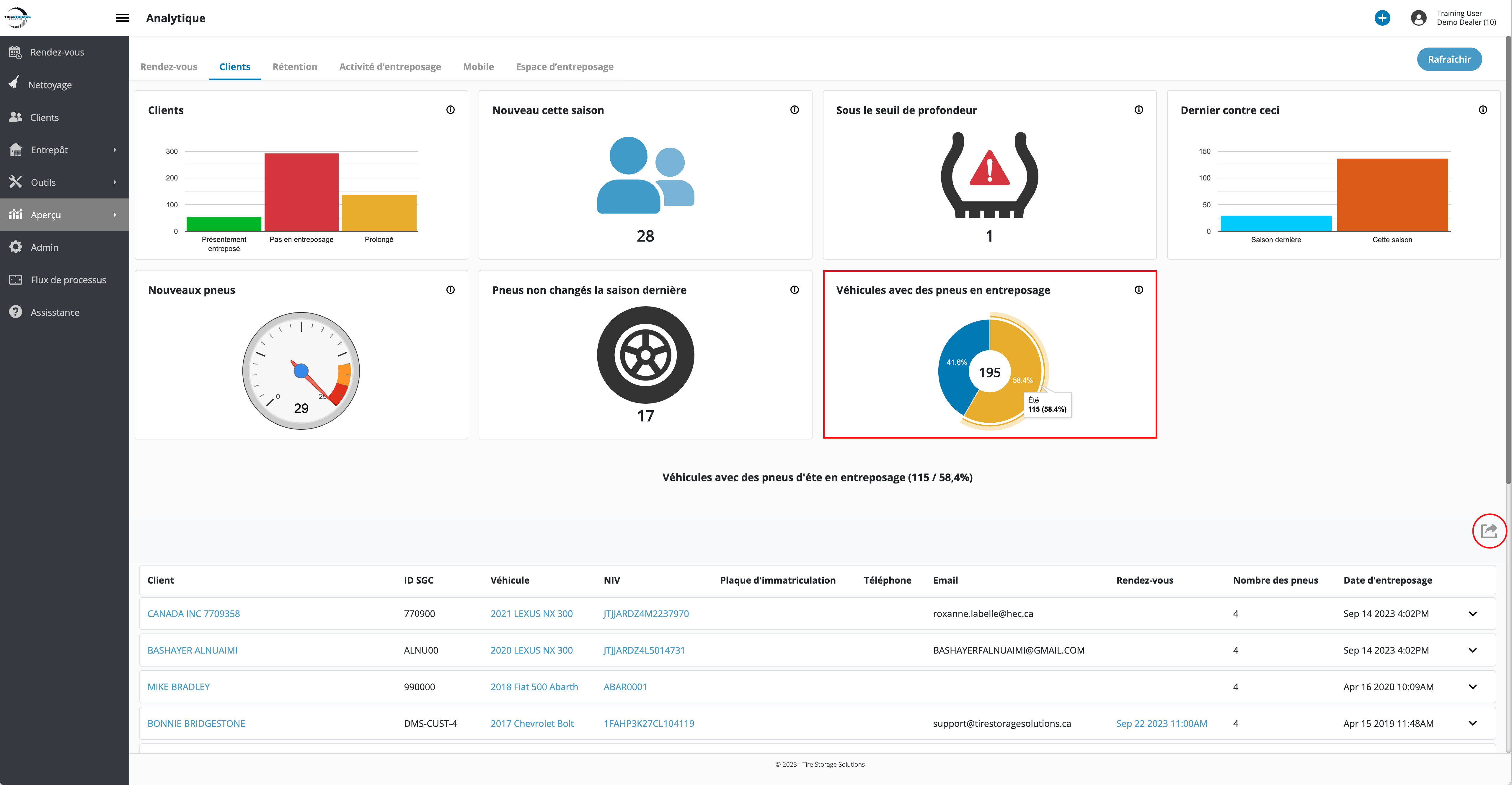 - Accédez à Aperçu → Analytique → Clients → Véhicules avec des pneus en entreposage widget.