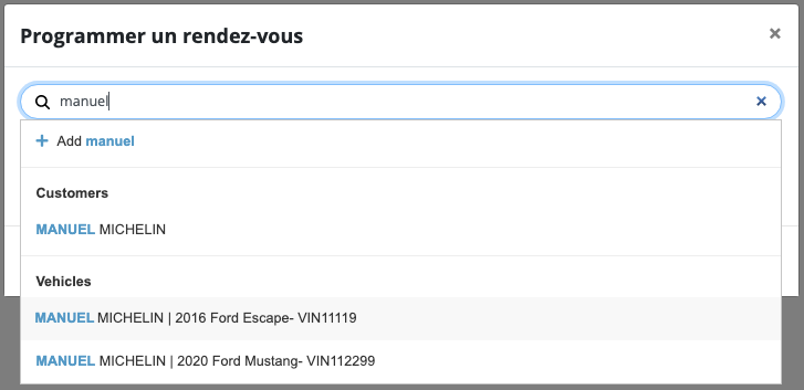 - CONSEIL: Si le client a un rendez-vous existant, il sera affiché dans la section Rendez-vous de la recherche. Cliquez sur le rendez-vous existant et reprogrammez le plutôt que de créer un deuxième rendez-vous.