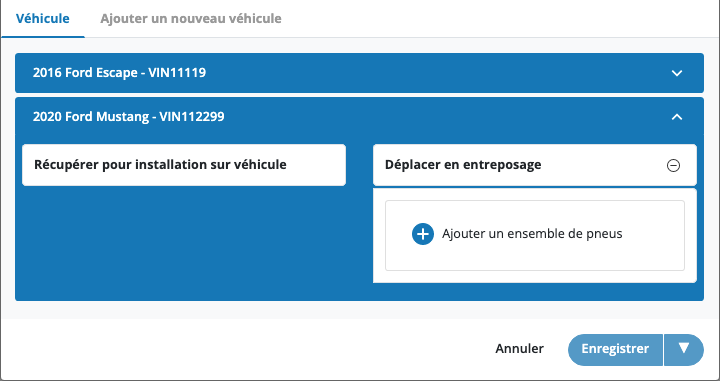 - Sélectionnez un ensemble de pneus à récupérer dans la liste déroulante (si aucun pneu n’est entreposé, cette option ne sera pas disponible).