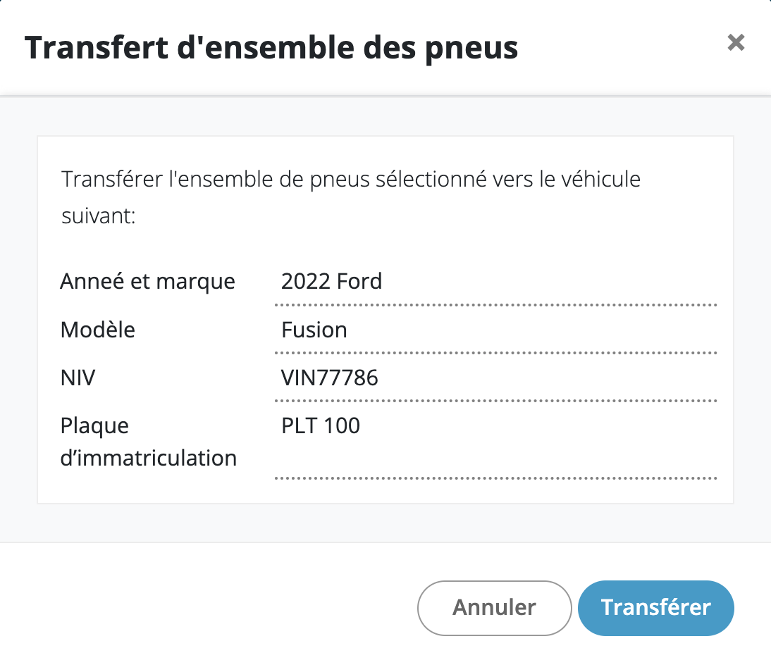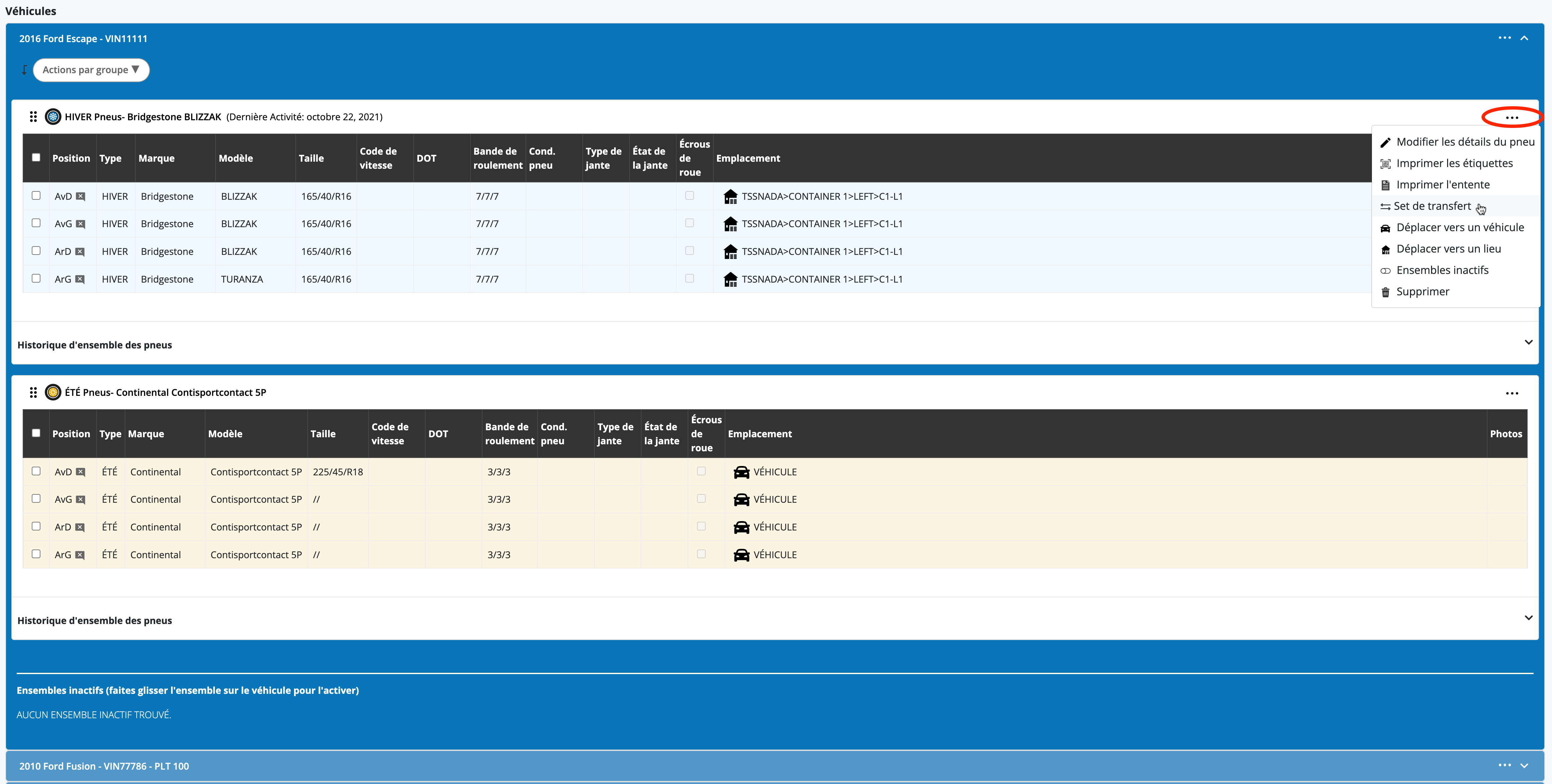 Si un client possède plusieurs véhicules, les utilisateurs peuvent transférer un ensemble de pneus d'un véhicule à un autre.