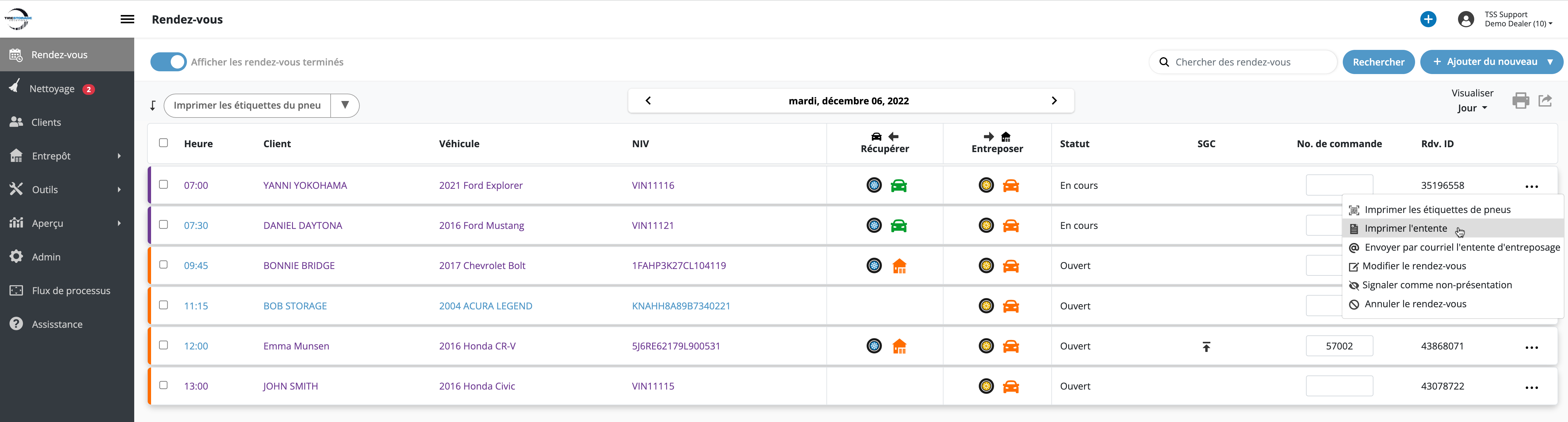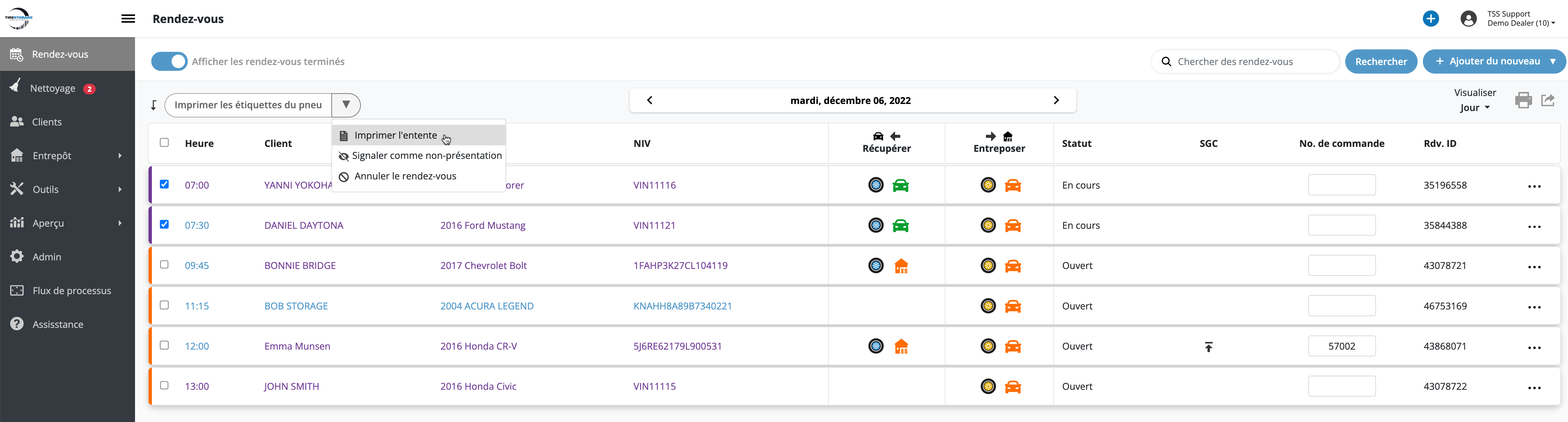 - Sélectionnez les rendez-vous pour lesquels une entnte d'entreposage de pneus est requise.