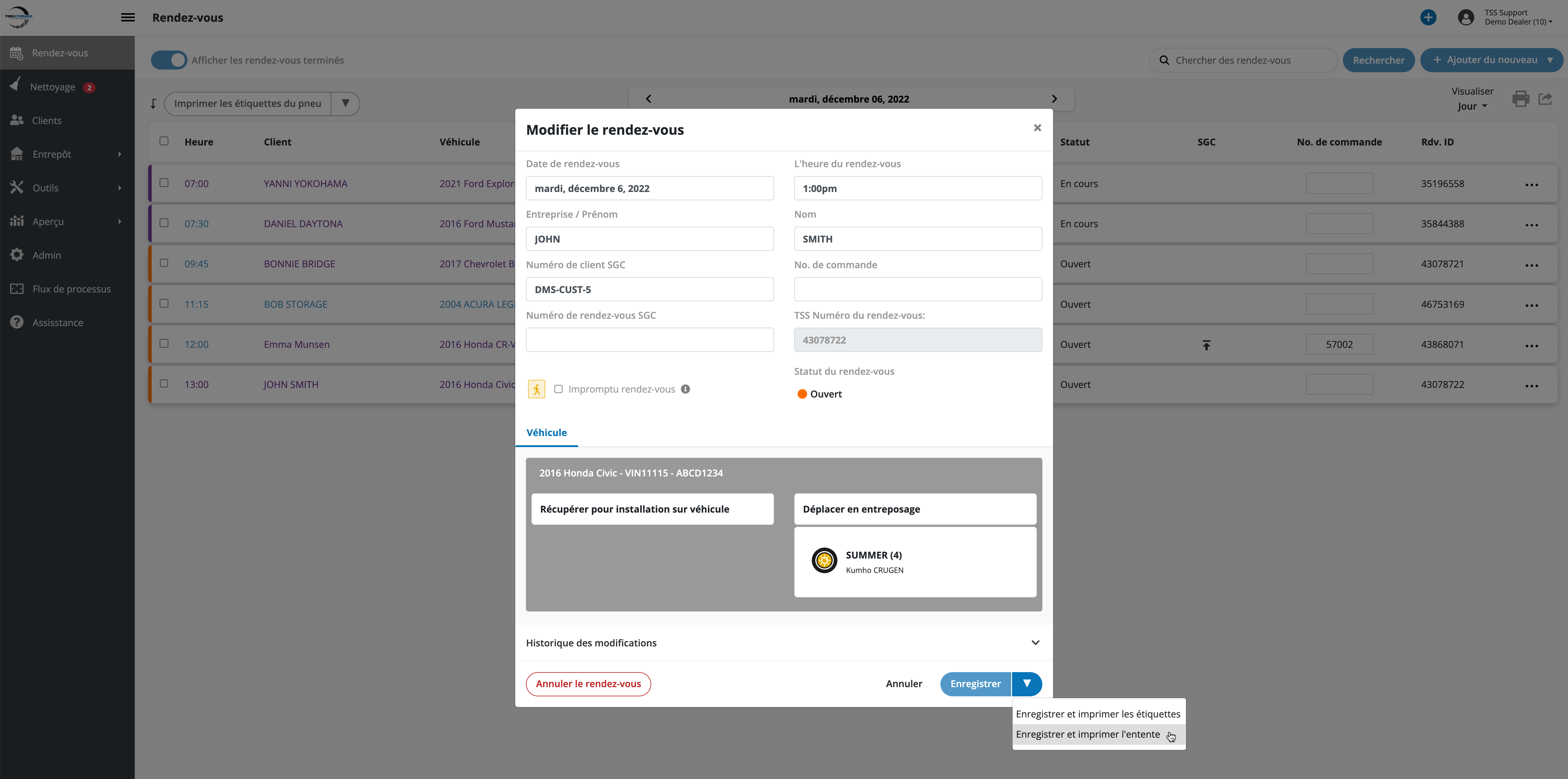 Imprimer l'entente d'entreposage de pneus à partir de la fenêtre modale de rendez-vous