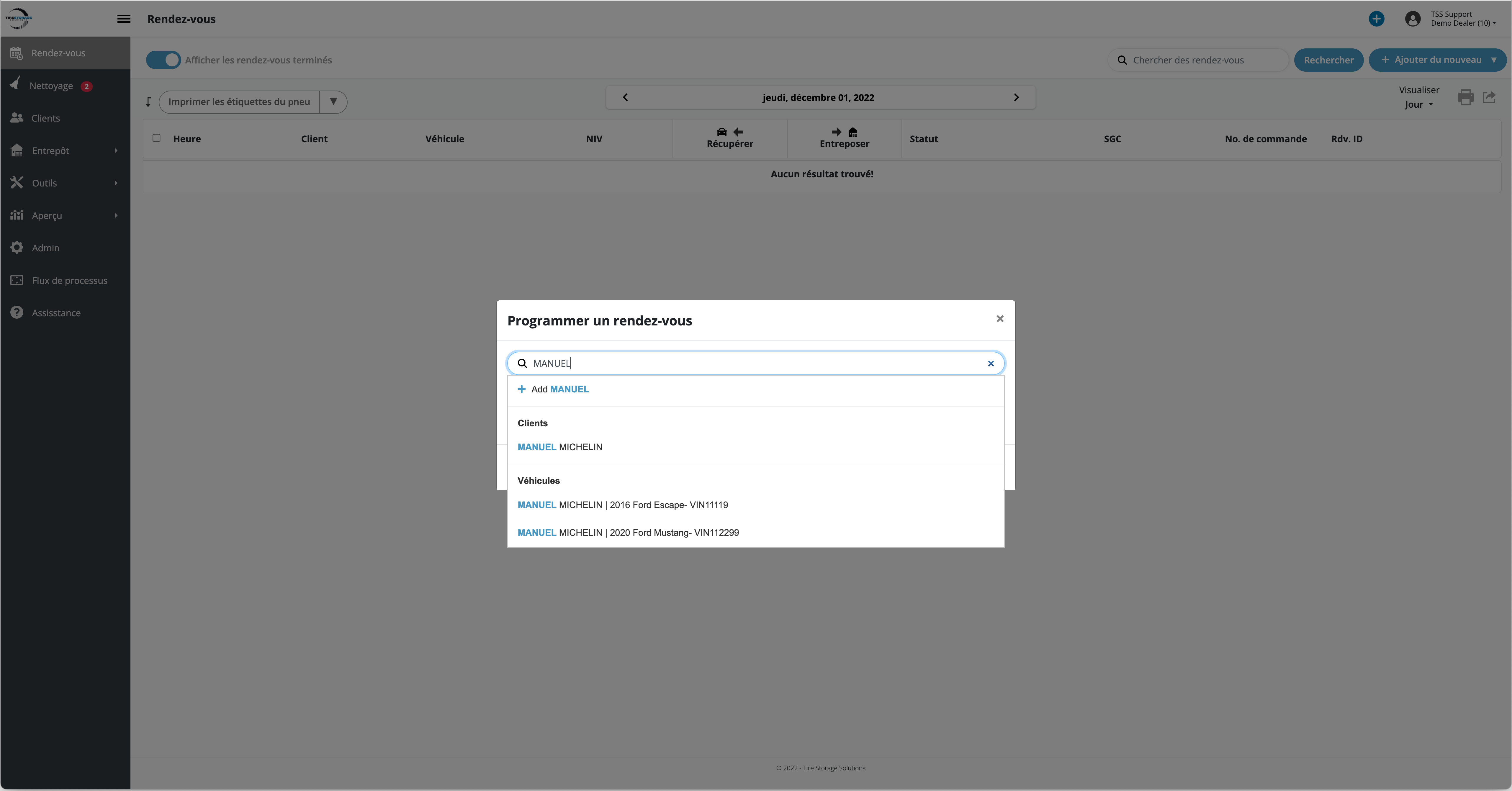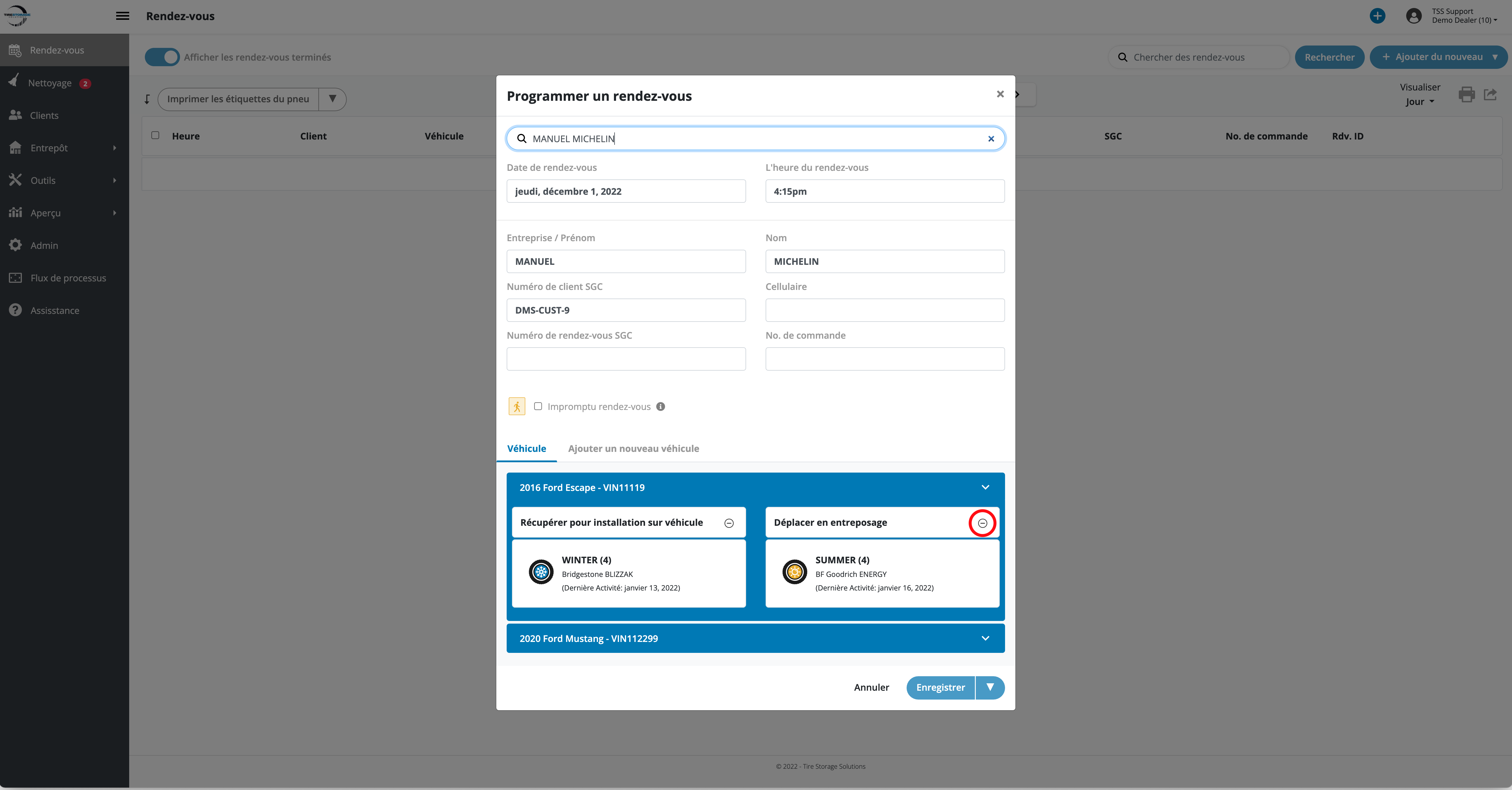 4. Si le client a des pneus entreposés, ils apparaîtront dans la colonne Récupérer pour installation sur véhicule.