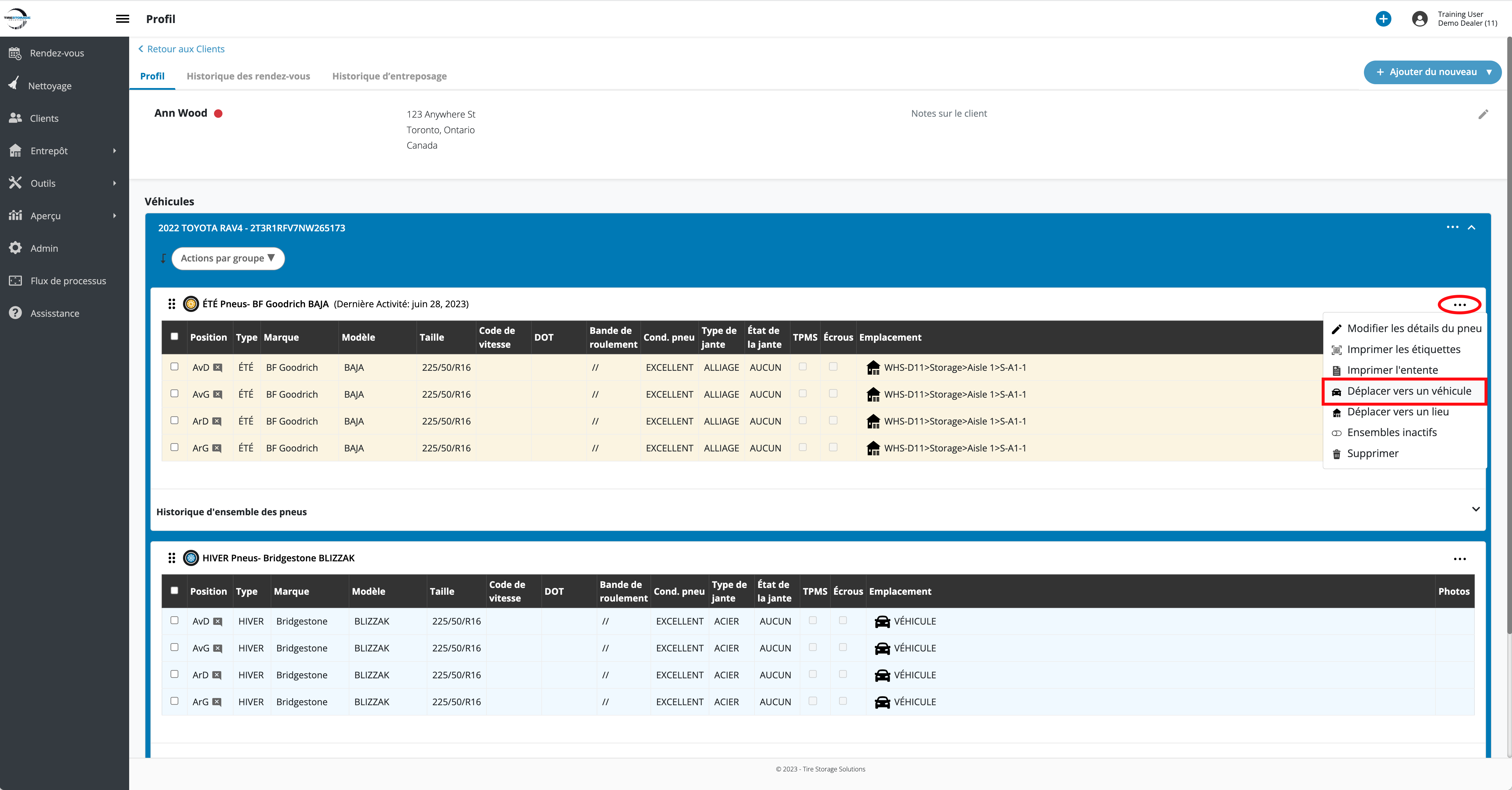3. Cliquez sur le menu ••• correspondant à l'ensemble à supprimer du stockage et sélectionnez l'option Déplacer vers un véhicule.