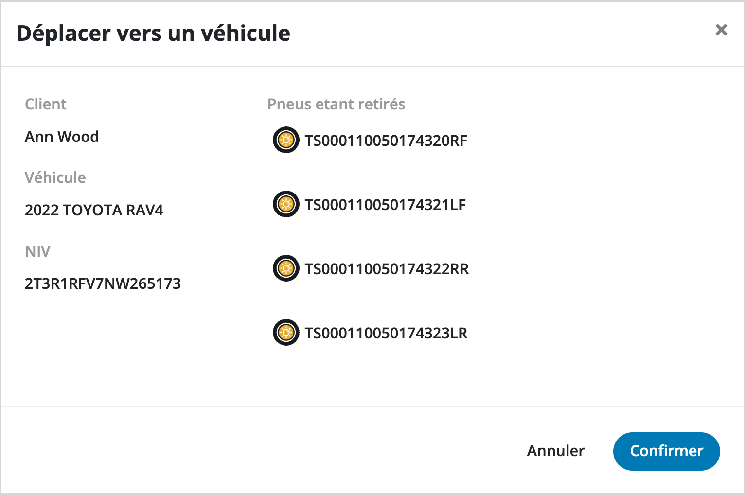 4. Dans la fenêtre contextuelle de confirmation, cliquez sur le bouton Confirmer pour supprimer les pneus sélectionnés d'entreposage.