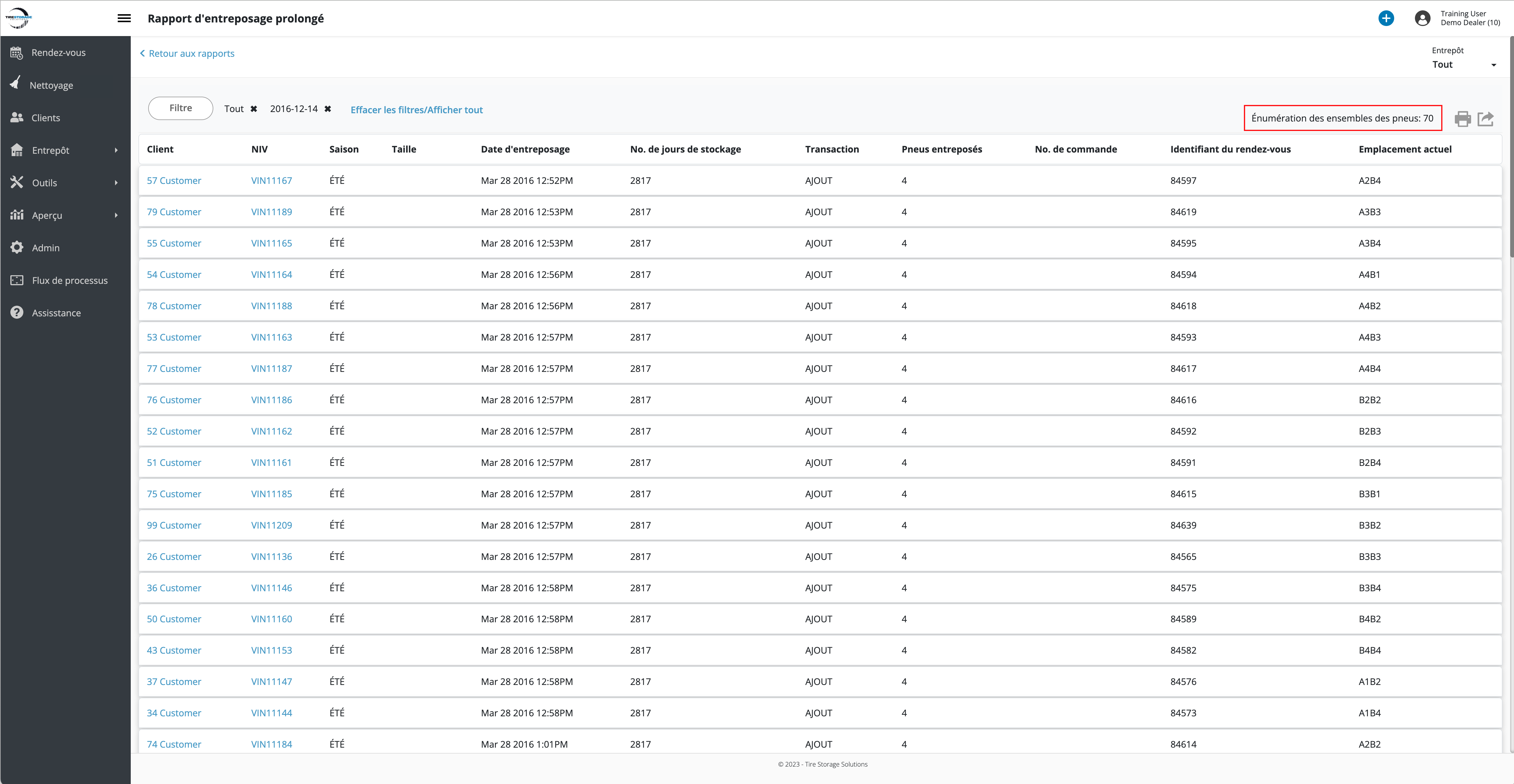 ATTENTION: À des fins de facturation, le rétablissement du jeu de pneus fera apparaître le jeu comme un nouveau stockage sur le rapport des pneus entreposés initialement.