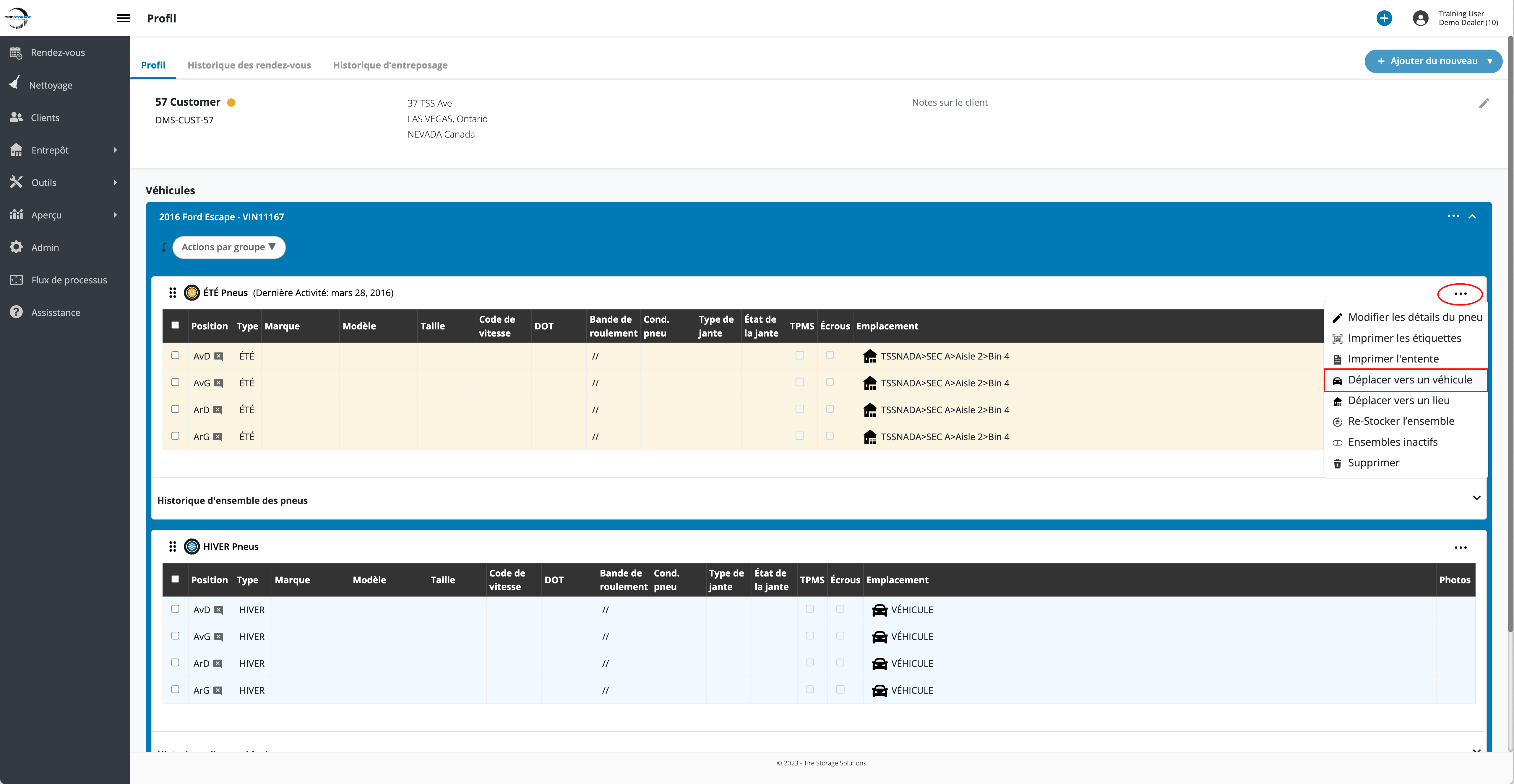 Déplacez les pneus vers le véhicule (le client ne stocke plus les pneus)